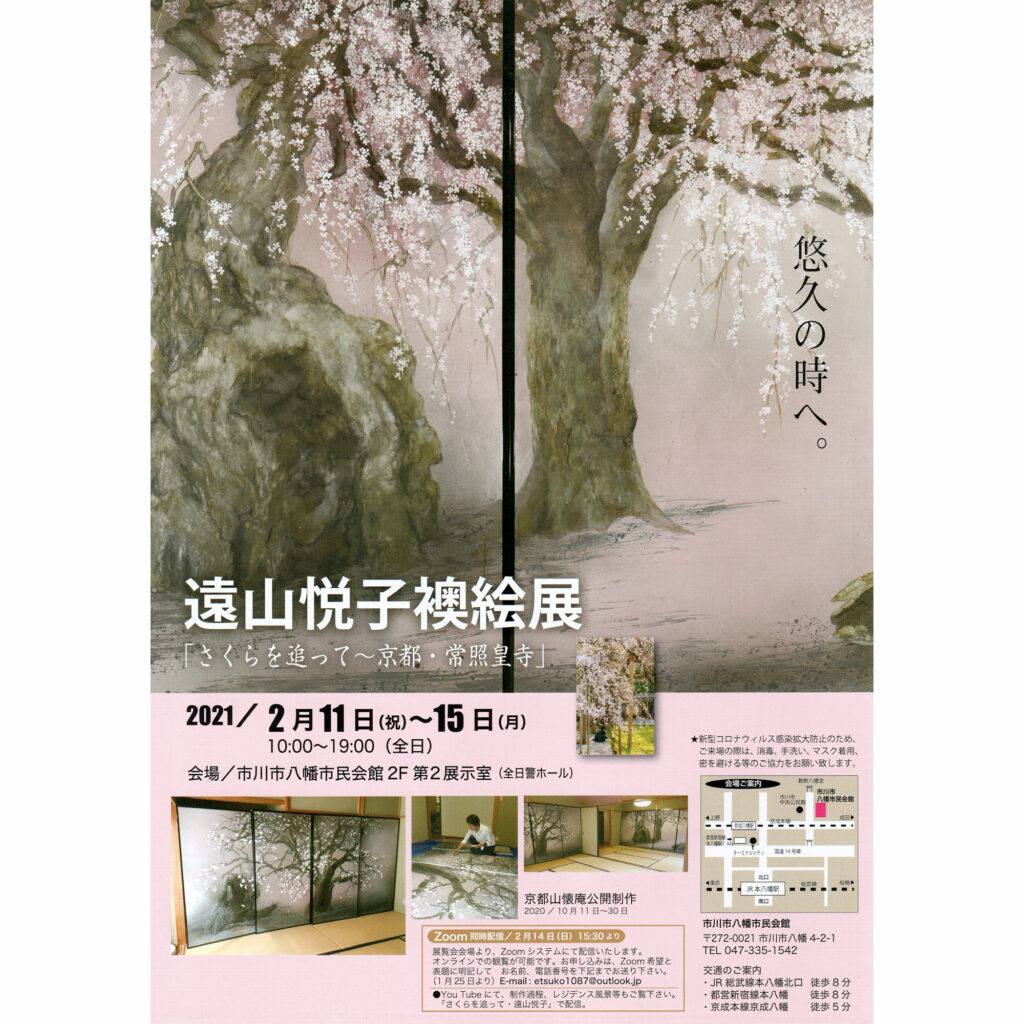 展示情報 展示名 遠山悦子襖絵展 「さくらを追って〜京都・常照皇寺」 日時 2021年2月11日(火・祝)〜15日(日) 10:00〜19:00 場所 全日警ホール(市川市八幡市民会館) 2F 第2展示室 〒272-0021 千葉県市川市八幡4-2-1 TEL:047-335-1542 備考 -- ■Zoom同... -