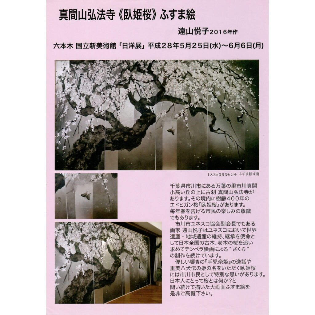 `展示情報 展示名 真間山弘法寺〈臥姫桜〉ふすま絵 日時 2016年5月25日(水)〜6月6日(月) 10:00〜17:00 場所 六本木 国立新美術館「日洋展」 〒106-8558 東京都港区六本木7丁目22-2 備考 -- 千葉県市川市にある万葉の里市川真間、小高い丘の上に古刹 真...