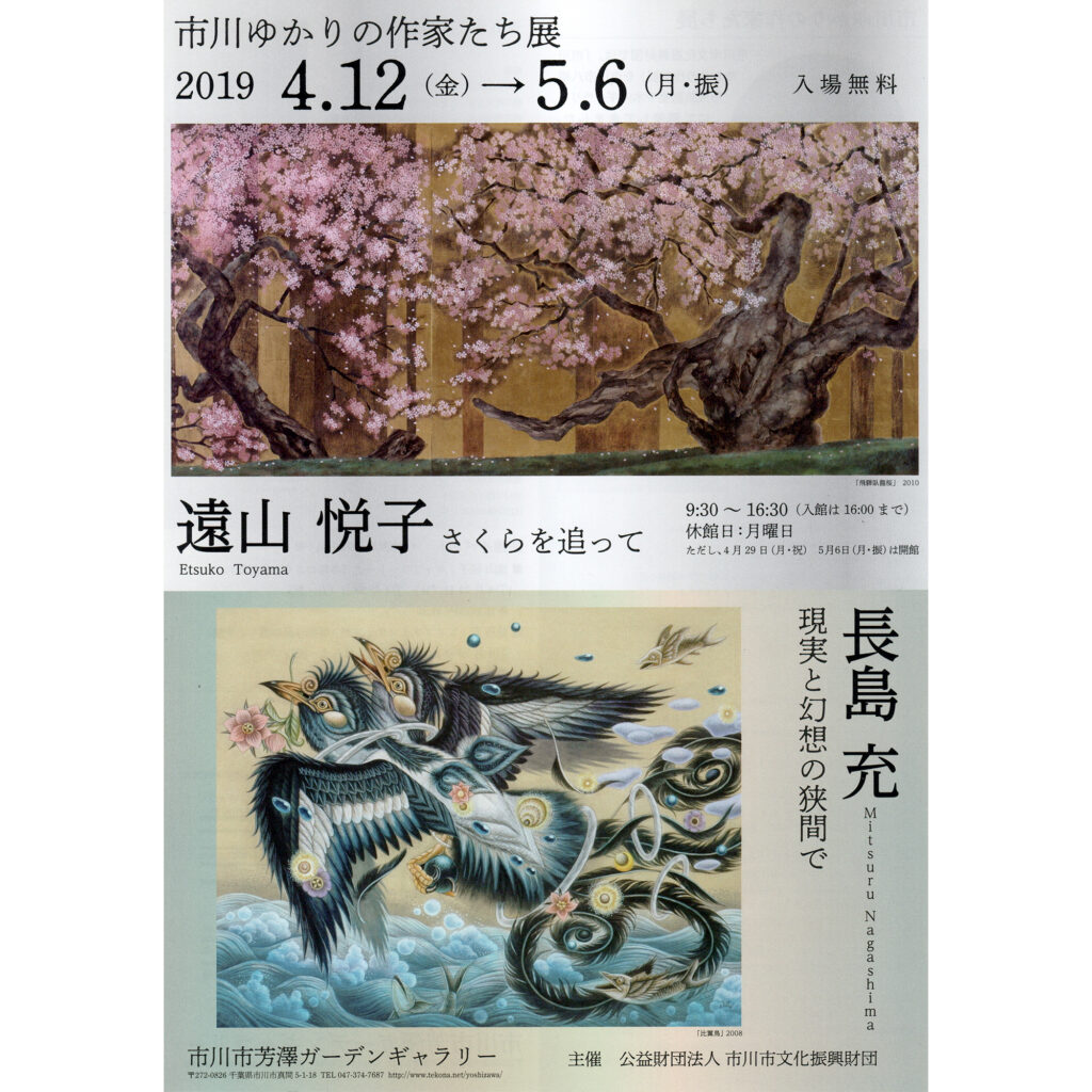 展示情報 展示名 市川ゆかりの作家たち展 日時 2019年4月12日(金)〜5月6日(月・振) 9:30〜16:30(入館は16:00まで) 休館日:月曜日 ただし4月29日(月・祝)、5月6日(月・振)は開館 場所 市川市芳澤ガーデンギャラリー 〒272-0826 千葉県市川市真間5-1-18 ... -