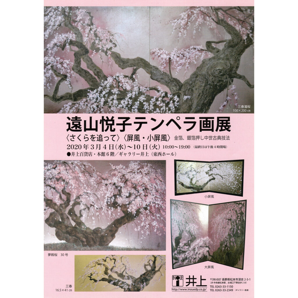 展示情報 展示名 遠山悦子テンペラ画展「さくらを追って」 日時 2020年3月4日(水)〜10日(火) 10:00〜19:00 最終日は16:00閉場 場所 井上百貨店 本館6階/ギャラリー井上 〒390-8507 長野県松本市深志2−3−1 TEL:0263-33-2349 備考 -- -