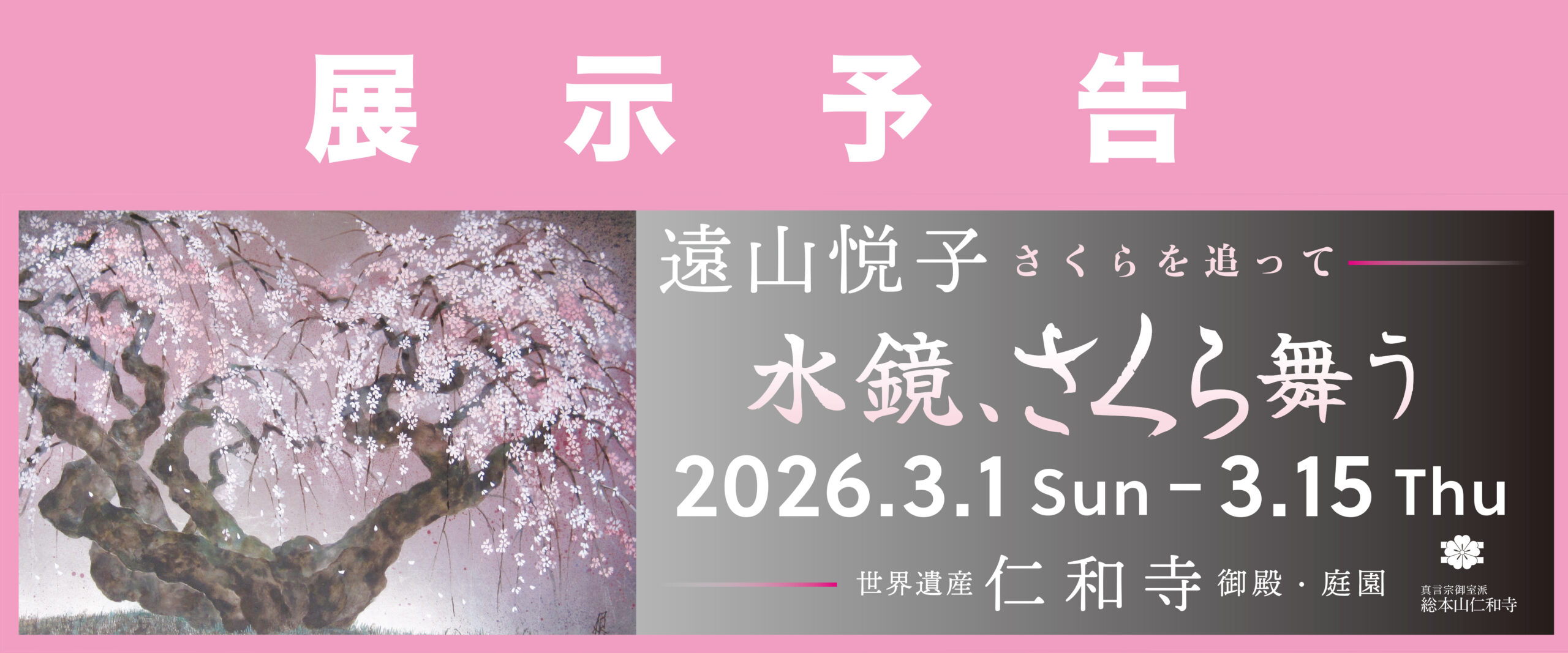 展示情報 展示名 遠山悦子展「水鏡、さくら舞う」 日時 2026年3月1日(日)〜3月15日(木) 10:00〜17:00 場所 世界遺産 仁和寺 御殿・庭園 〒616-8092 京都府京都市右京区御室大内33 TEL:075-461-1155 備考 料金:無料/仁和寺御所庭園拝観料 800円 画家... -